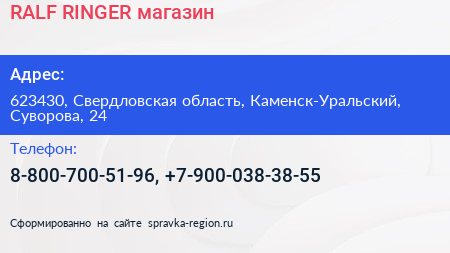 RALF RINGER, магазин по адресу 623430, Свердловская область, Каменск-Уральский, Суворова, 24 в дальнейшем Организация, размещена в следующих категориях: