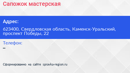 Сапожок, мастерская по адресу 623400, Свердловская область, Каменск-Уральский, проспект Победы, 22 в дальнейшем Организация, размещена в следующих категориях: