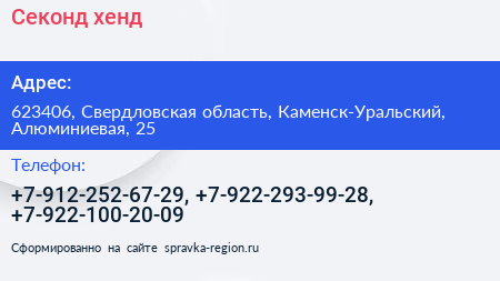 Секонд-хенд по адресу 623406, Свердловская область, Каменск-Уральский, Алюминиевая, 25 в дальнейшем Организация, размещена в следующих категориях: