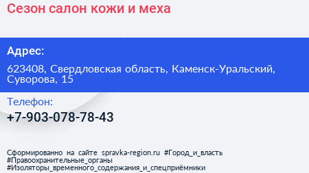Сезон, салон кожи и меха по адресу 623408, Свердловская область, Каменск-Уральский, Суворова, 15 в дальнейшем Организация, размещена в следующих категориях: