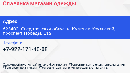 Славянка, магазин одежды по адресу 623400, Свердловская область, Каменск-Уральский, проспект Победы, 11а в дальнейшем Организация, размещена в следующих категориях:
