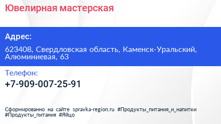 Ювелирная мастерская по адресу 623408, Свердловская область, Каменск-Уральский, Алюминиевая, 63 в дальнейшем Организация, размещена в следующих категориях: