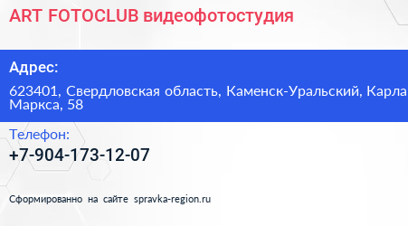 ART-FOTOCLUB, видеофотостудия по адресу 623401, Свердловская область, Каменск-Уральский, Карла Маркса, 58 в дальнейшем Организация, размещена в следующих категориях: