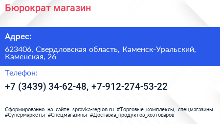 Бюрократ, магазин по адресу 623406, Свердловская область, Каменск-Уральский, Каменская, 26 в дальнейшем Организация, размещена в следующих категориях: