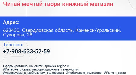 Читай, мечтай, твори, книжный магазин по адресу 623430, Свердловская область, Каменск-Уральский, Суворова, 28 в дальнейшем Организация, размещена в следующих категориях: