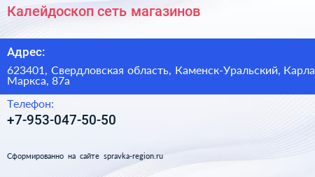 Калейдоскоп, сеть магазинов по адресу 623401, Свердловская область, Каменск-Уральский, Карла Маркса, 87а в дальнейшем Организация, размещена в следующих категориях: