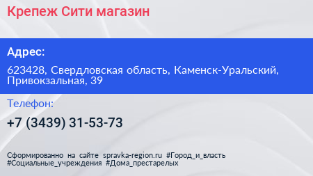 Крепеж-Сити, магазин по адресу 623428, Свердловская область, Каменск-Уральский, Привокзальная, 39 в дальнейшем Организация, размещена в следующих категориях: