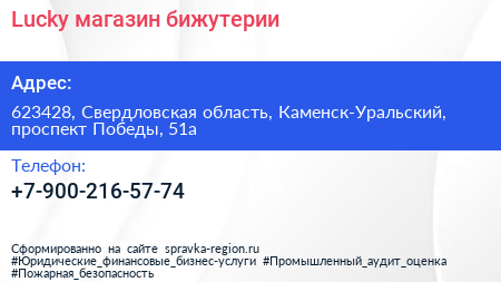 Lucky, магазин бижутерии по адресу 623428, Свердловская область, Каменск-Уральский, проспект Победы, 51а в дальнейшем Организация, размещена в следующих категориях: