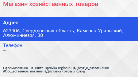 Магазин хозяйственных товаров по адресу 623406, Свердловская область, Каменск-Уральский, Алюминиевая, 38 в дальнейшем Организация, размещена в следующих категориях: