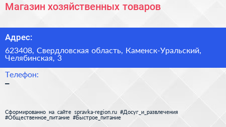 Магазин хозяйственных товаров по адресу 623408, Свердловская область, Каменск-Уральский, Челябинская, 3 в дальнейшем Организация, размещена в следующих категориях: