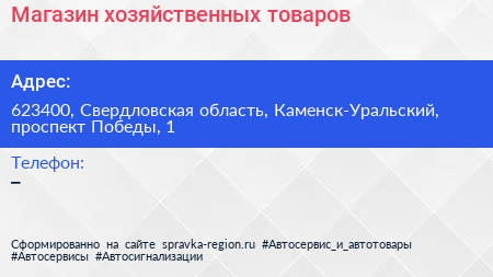 Магазин хозяйственных товаров по адресу 623400, Свердловская область, Каменск-Уральский, проспект Победы, 1 в дальнейшем Организация, размещена в следующих категориях: