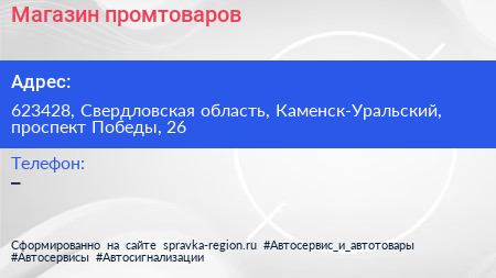 Магазин промтоваров по адресу 623428, Свердловская область, Каменск-Уральский, проспект Победы, 26 в дальнейшем Организация, размещена в следующих категориях: