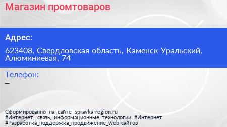 Магазин промтоваров по адресу 623408, Свердловская область, Каменск-Уральский, Алюминиевая, 74 в дальнейшем Организация, размещена в следующих категориях: