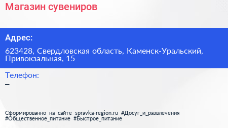 Магазин сувениров по адресу 623428, Свердловская область, Каменск-Уральский, Привокзальная, 15 в дальнейшем Организация, размещена в следующих категориях: