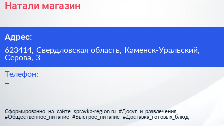 Натали, магазин по адресу 623414, Свердловская область, Каменск-Уральский, Серова, 3 в дальнейшем Организация, размещена в следующих категориях: