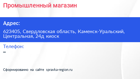Промышленный магазин по адресу 623405, Свердловская область, Каменск-Уральский, Центральная, 24д киоск в дальнейшем Организация, размещена в следующих категориях: