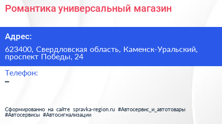 Романтика, универсальный магазин по адресу 623400, Свердловская область, Каменск-Уральский, проспект Победы, 24 в дальнейшем Организация, размещена в следующих категориях: