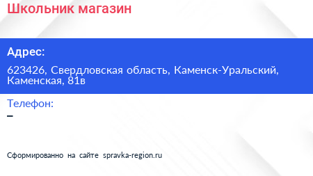 Школьник, магазин по адресу 623426, Свердловская область, Каменск-Уральский, Каменская, 81в в дальнейшем Организация, размещена в следующих категориях: