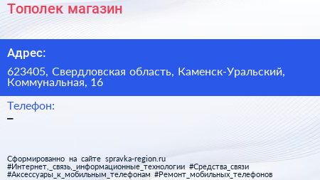 Тополек, магазин по адресу 623405, Свердловская область, Каменск-Уральский, Коммунальная, 16 в дальнейшем Организация, размещена в следующих категориях: