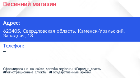 Весенний, магазин по адресу 623405, Свердловская область, Каменск-Уральский, Западная, 18 в дальнейшем Организация, размещена в следующих категориях: