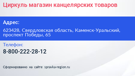 Циркуль, магазин канцелярских товаров по адресу 623428, Свердловская область, Каменск-Уральский, проспект Победы, 65 в дальнейшем Организация, размещена в следующих категориях: