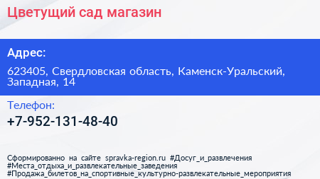 Цветущий сад, магазин по адресу 623405, Свердловская область, Каменск-Уральский, Западная, 14 в дальнейшем Организация, размещена в следующих категориях: