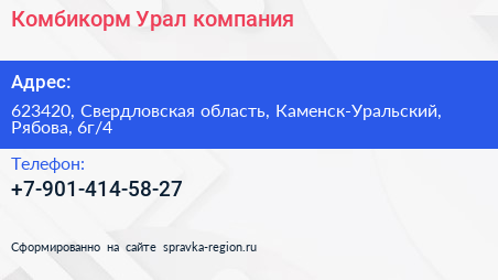 Комбикорм-Урал, компания по адресу 623420, Свердловская область, Каменск-Уральский, Рябова, 6г/4 в дальнейшем Организация, размещена в следующих категориях: