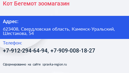 Кот Бегемот, зоомагазин по адресу 623408, Свердловская область, Каменск-Уральский, Шестакова, 54 в дальнейшем Организация, размещена в следующих категориях: