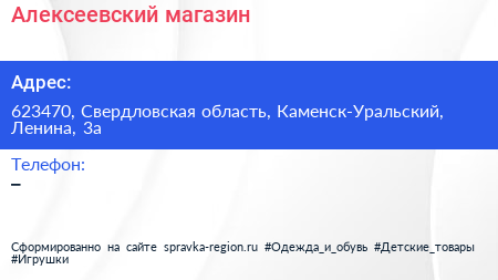 Алексеевский, магазин по адресу 623470, Свердловская область, Каменск-Уральский, Ленина, 3а в дальнейшем Организация, размещена в следующих категориях:
