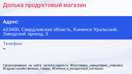 Долька, продуктовый магазин по адресу 623400, Свердловская область, Каменск-Уральский, Заводской проезд, 3 в дальнейшем Организация, размещена в следующих категориях: