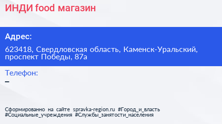ИНДИ food, магазин по адресу 623418, Свердловская область, Каменск-Уральский, проспект Победы, 87а в дальнейшем Организация, размещена в следующих категориях:
