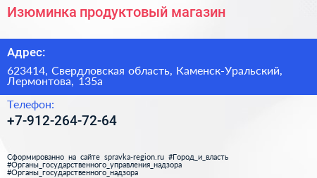 Изюминка, продуктовый магазин по адресу 623414, Свердловская область, Каменск-Уральский, Лермонтова, 135а в дальнейшем Организация, размещена в следующих категориях: