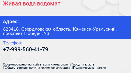 Живая вода, водомат по адресу 623418, Свердловская область, Каменск-Уральский, проспект Победы, 93 в дальнейшем Организация, размещена в следующих категориях: