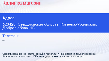 Калинка, магазин по адресу 623428, Свердловская область, Каменск-Уральский, Добролюбова, 1Б в дальнейшем Организация, размещена в следующих категориях: