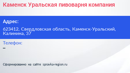 Каменск-Уральская пивоварня, компания по адресу 623412, Свердловская область, Каменск-Уральский, Калинина, 37 в дальнейшем Организация, размещена в следующих категориях:
