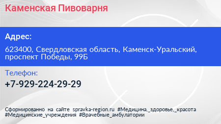 Каменская Пивоварня по адресу 623400, Свердловская область, Каменск-Уральский, проспект Победы, 99Б в дальнейшем Организация, размещена в следующих категориях: