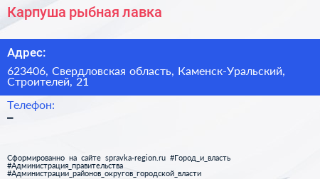 Карпуша, рыбная лавка по адресу 623406, Свердловская область, Каменск-Уральский, Строителей, 21 в дальнейшем Организация, размещена в следующих категориях: