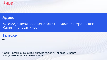 Киви по адресу 623426, Свердловская область, Каменск-Уральский, Калинина, 52Б киоск в дальнейшем Организация, размещена в следующих категориях: