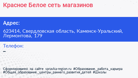 Красное & Белое, сеть магазинов по адресу 623414, Свердловская область, Каменск-Уральский, Лермонтова, 179 в дальнейшем Организация, размещена в следующих категориях: