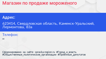Магазин по продаже мороженого по адресу 623414, Свердловская область, Каменск-Уральский, Лермонтова, 83а в дальнейшем Организация, размещена в следующих категориях: