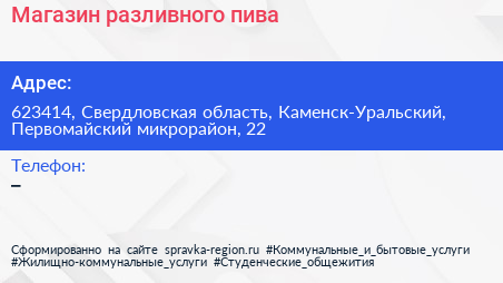 Магазин разливного пива по адресу 623414, Свердловская область, Каменск-Уральский, Первомайский микрорайон, 22 в дальнейшем Организация, размещена в следующих категориях: