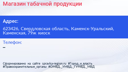 Магазин табачной продукции по адресу 623426, Свердловская область, Каменск-Уральский, Каменская, 79ж киоск в дальнейшем Организация, размещена в следующих категориях: