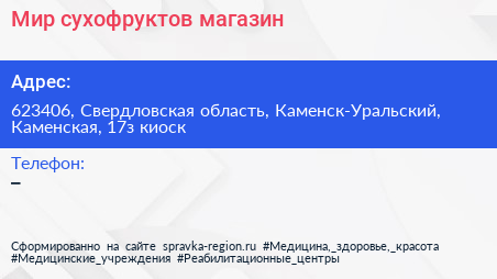 Мир сухофруктов, магазин по адресу 623406, Свердловская область, Каменск-Уральский, Каменская, 17з киоск в дальнейшем Организация, размещена в следующих категориях: