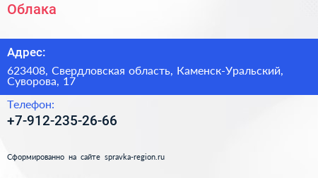 Облака по адресу 623408, Свердловская область, Каменск-Уральский, Суворова, 17 в дальнейшем Организация, размещена в следующих категориях: