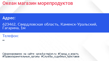 Океан, магазин морепродуктов по адресу 623462, Свердловская область, Каменск-Уральский, Гагарина, 1м в дальнейшем Организация, размещена в следующих категориях: