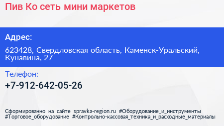 Пив & Ко, сеть мини-маркетов по адресу 623428, Свердловская область, Каменск-Уральский, Кунавина, 27 в дальнейшем Организация, размещена в следующих категориях: