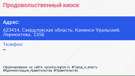 Продовольственный киоск по адресу 623414, Свердловская область, Каменск-Уральский, Лермонтова, 135Б в дальнейшем Организация, размещена в следующих категориях:
