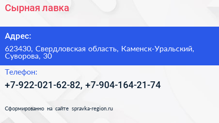 Сырная лавка по адресу 623430, Свердловская область, Каменск-Уральский, Суворова, 30 в дальнейшем Организация, размещена в следующих категориях: