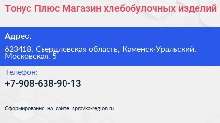 Тонус-Плюс, Магазин хлебобулочных изделий по адресу 623418, Свердловская область, Каменск-Уральский, Московская, 5 в дальнейшем Организация, размещена в следующих категориях: