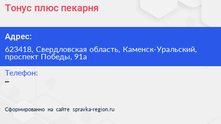 Тонус-плюс, пекарня по адресу 623418, Свердловская область, Каменск-Уральский, проспект Победы, 91а в дальнейшем Организация, размещена в следующих категориях: